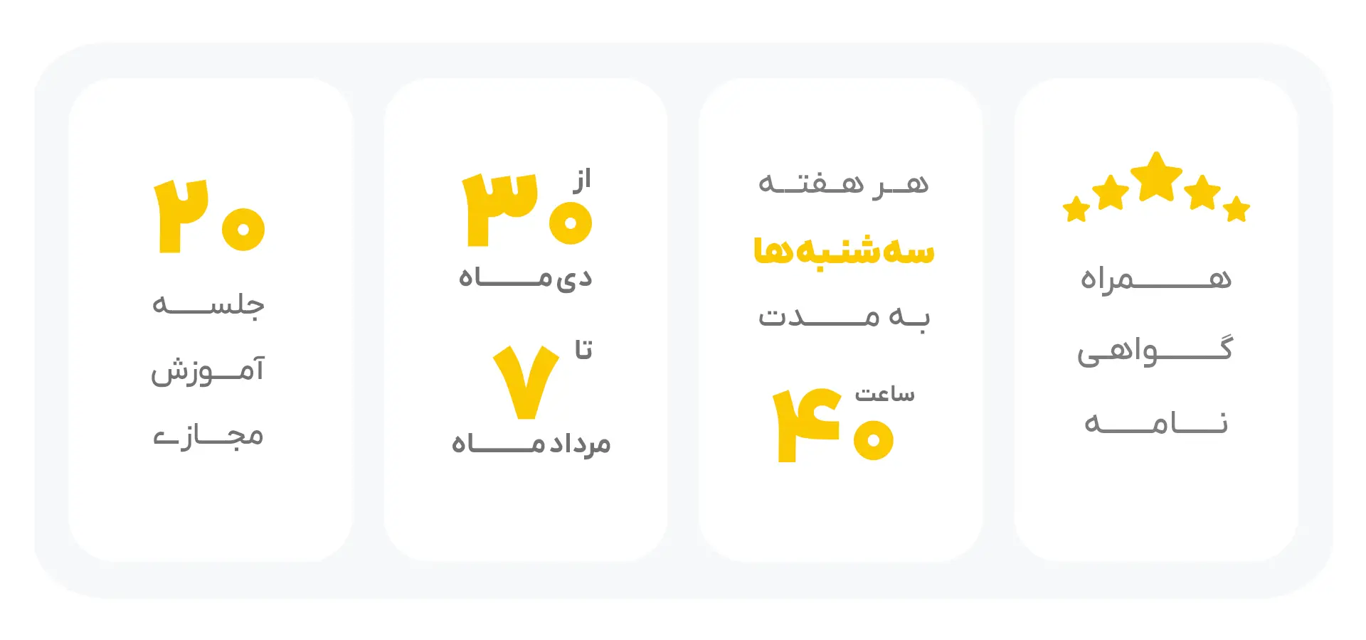 این دوره در 20 جلسه هر هفته 3 شنبه ها برگزار می‌شود .  این دوره از 30 دی ماه آغاز می‌‌شود و تا 7 مرداد ماه 1405 است . این دوره در قالب 40 ساعت برگزار می‌‌شود .  این دوره دارای گواهی نامه معتبر هست و در پایان دوره به شرکت کنندگان گواهی‌نامه